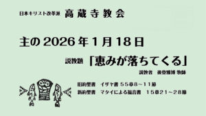 2026年1月18日の礼拝説教動画をアップました 2026.01.26 2026年1月18日 礼拝説教をYouTubeにアップしました。 こちらからもご覧いただけます。 上の文字をクリックしてください。